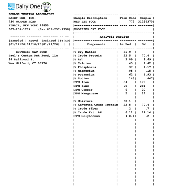 Benefits: Bootsie's is a meat-forward, high-protein, limited-ingredient food for kittens and cats made of whole foods, vitamins, and a vitamin/mineral mix to ensure a balance of proper nutrients. It is handmade, highly digestible, and free from preservatives and fillers.