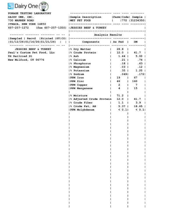 Ingredients: Ground beef, Ground turkey, Kale, Carrots, Brown rice, Apples, Blueberries, Eggs, Anchovy + sardine oil, Vitamin + trace minerals - Potassium Citrate, DiCalcium Phosphate, Calcium Carbonate, Garbanzo Beans, Choline Bitartrate, Taurine, Salt, Zinc Proteinate, Magnesium Oxide, Iron Proteinate, Vitamin E, Copper Proteinate, Manganese Proteinate, Vitamin B-12, Selenium, Niacin, Ribofalvin, Calcium Pantothenate, Thiamine, Vitamin A, Vitamin D, Calcium Iodate, Vitamin B6, Folic Acid