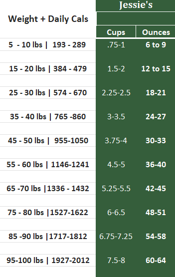 Feeding Info: Hover over the feeding chart image for recommendations based on age, weight, activity level, and Body Condition Score (BCS).