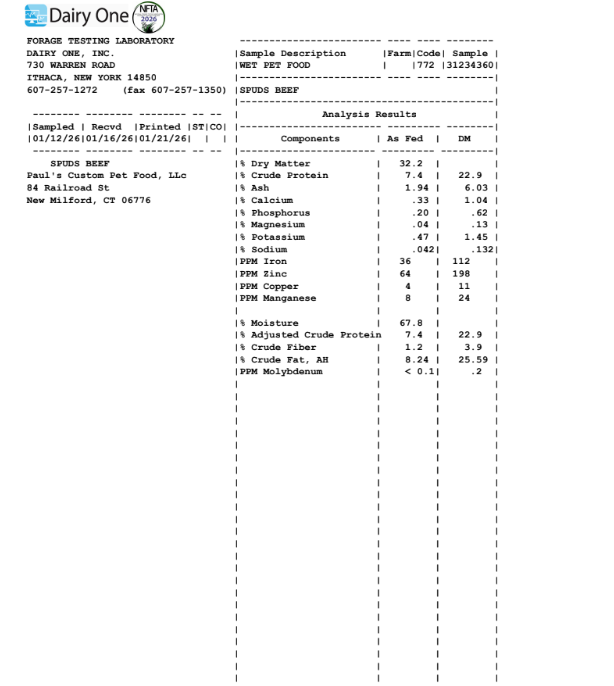 Benefits: Spud’s is a grain-free, limited-ingredient recipe containing multiple fiber sources with prebiotic tendencies. It has a moderate protein and fiber content with high fat and energy content. Rich in essential fatty acids recognized for their nutritional role for proper growth, healthy metabolism, immune system support, and the maintenance of healthy skin and coat. Spud's may be used as a full meal or a topper.
