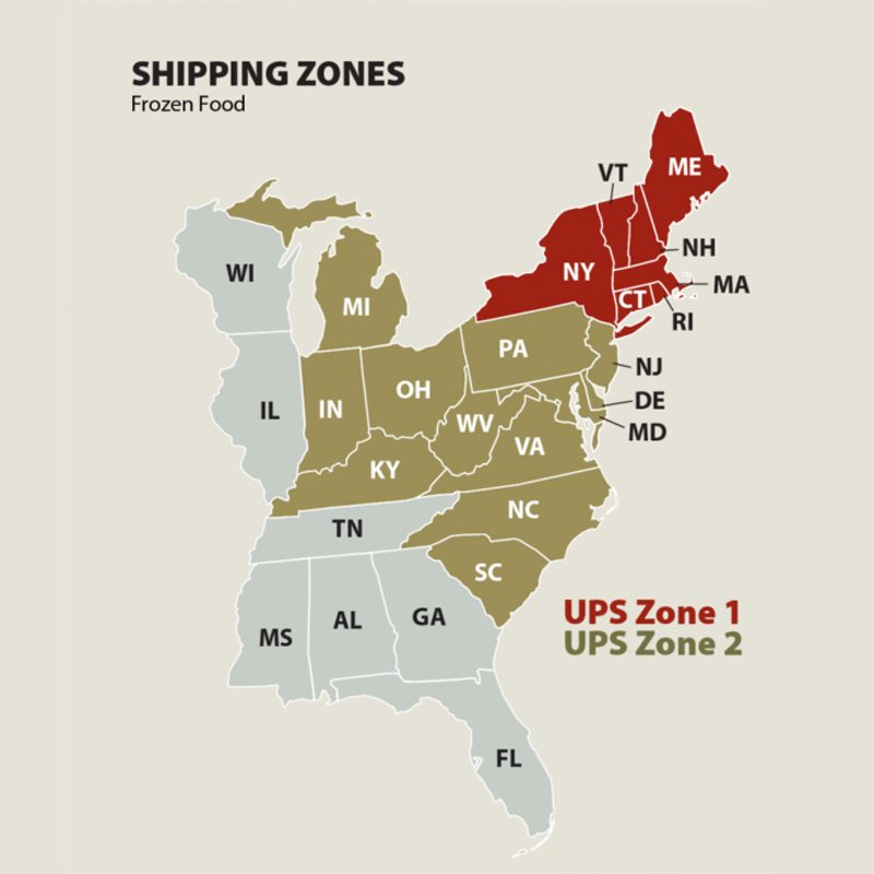 We ship frozen food to UPS Zones 1 and 2 (see map) by UPS Ground and other areas via Overnight or 2-day air. Non-frozen items ship via UPS Ground to anywhere in the US; no P.O. boxes, please.